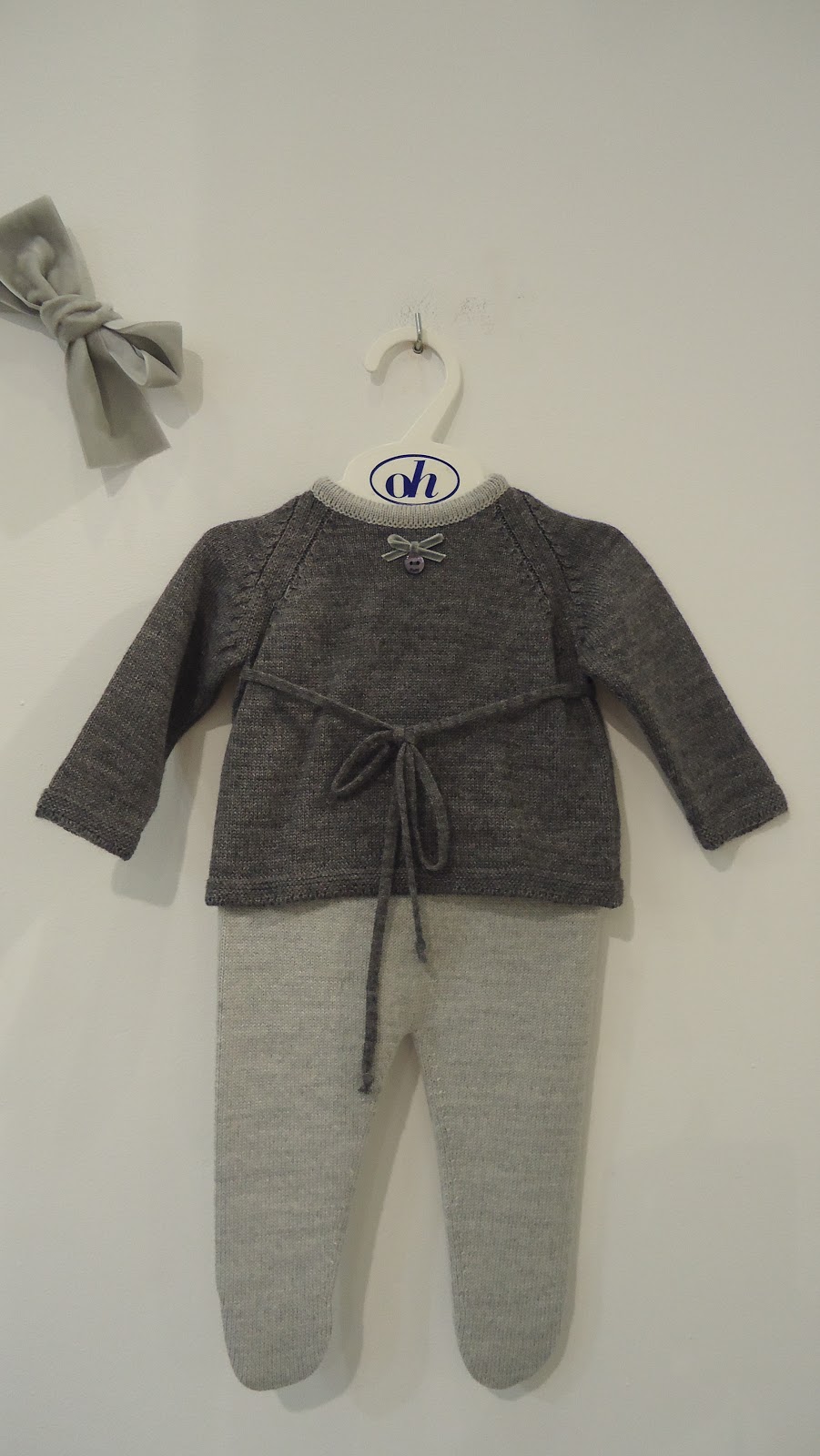 Pelele todo gris claro. Tiene botones delante y el punto hace unos dibujos muy finos aunque en la foto no se aprecie.